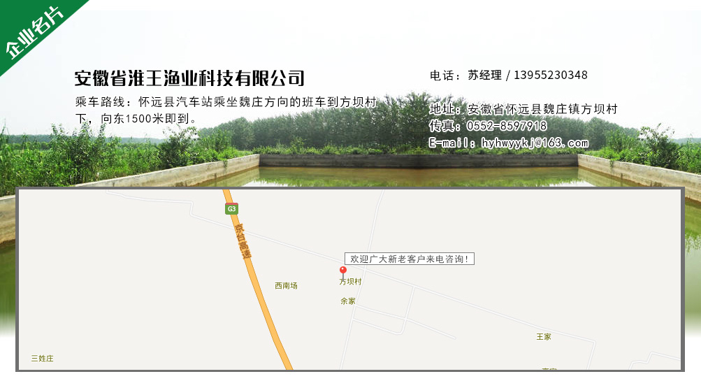 安徽省淮王漁業(yè)科技有限公司是一家股份制民營科技企業(yè)。2004年成立,公司以“創(chuàng)新機制與理念、強調(diào)特色與效益、注重質(zhì)量與品牌、依靠科技與合作、發(fā)展龍頭與產(chǎn)業(yè)”為指導(dǎo)思想,主營泥鰍等魚類苗種繁育、臺灣泥鰍養(yǎng)殖以及觀光休閑漁業(yè),承擔(dān)了多項國家、安徽省、市、縣有關(guān)項目的實施工作。 公司基地位于懷遠(yuǎn)縣魏莊鎮(zhèn)方壩村,懷魏路東1公里,北靠青溝河。這里電力通暢,交通方便,水源充沛,水質(zhì)清新,周邊無工業(yè)污染。該良種場是我國以泥鰍、大鱗副泥鰍等鰍科魚類的種質(zhì)資源保護和良種繁育為主的泥鰍良種繁育基地。良種場建設(shè)標(biāo)準(zhǔn)是以現(xiàn)代生物技術(shù)為依托,建成集科技化、生態(tài)化、設(shè)施化、休閑化為一體的開放式、園林式的國家級鰍科魚類原良種場。 公司現(xiàn)有人員65人,本科以上學(xué)歷6人,技術(shù)研發(fā)人員12人。主要產(chǎn)品是淮王牌泥鰍、大鱗副泥鰍苗種,商...公司環(huán)境展示